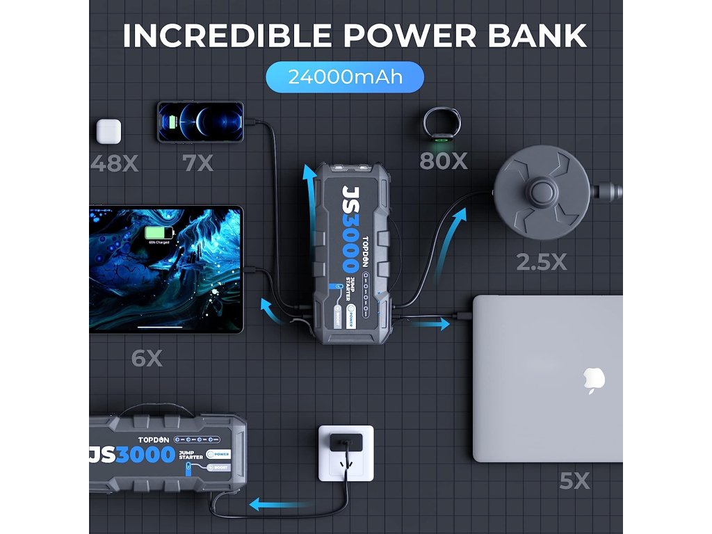 Extrémně výkonný car jump startér s kapacitou 24 000 mAh (88,8 Wh) a startovacím proudem až 3000 A. Spolehlivě nastartuje benzínové motory do 9,0 L a dieselové do 7,0 L. Ideální pro osobní i užitkové vozy, SUV, lodě a karavany.