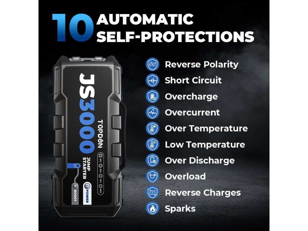 JumpSurge3000 je vybaven chytrým bezpečnostním systémem, který poskytuje 7 elektrických ochran pro bezpečí zařízení i automobilu. Obsahuje kontrolky, které upozorní na nesprávné připojení nebo použití.