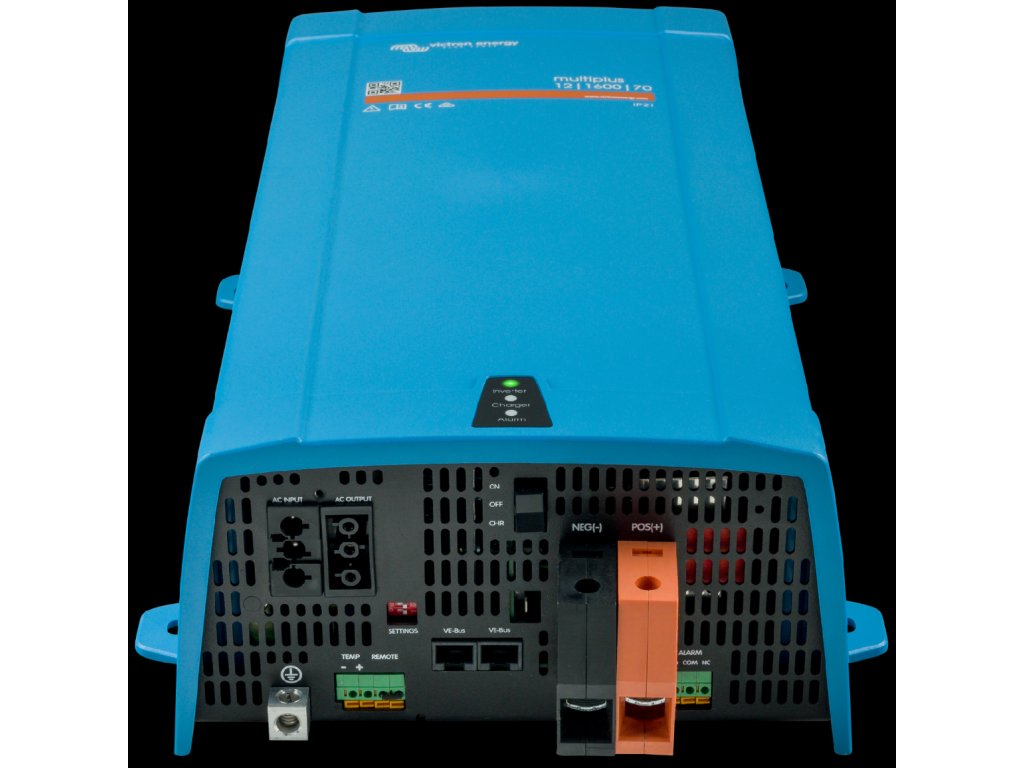 MultiPlus je výkonný sinusový měnič napětí a sofistikovaná nabíječka baterií s technologií adaptivního nabíjení a vysokorychlostní AC přepínačem. Hlavní vlastnosti:Paralelní provoz a třífázový provozPro dosažení vyššího výkonu může paralelně pracovat až šest jednotek MultiPlus. Kromě paralelního připojení lze tři jednotky nakonfigurovat pro třífázový výstup.Funkce PowerControlPomocí multifunkčního ovládacího panelu lze nastavit maximální proud generátoru nebo pobřežní přípojky, čímž se zabrání přetížení AC zdrojů.Funkce PowerAssist Tato funkce posouvá princip PowerControl na vyšší úroveň. Umožňuje MultiPlusu navýšit výkon alternativního zdroje napájení, který kompenzuje z baterie. Když se zátěž sníží, rezerva energie slouží k dobíjení baterie.Čtyřstupňová adaptivní nabíječka a duální nabíjení bateriíHlavní výstup poskytuje výkonné nabíjení bateriového systému pomocí pokročilého systému „adaptivního nabíjení“. Software jemně dolaďuje třístupňový automatický proces tak, aby vyhovoval stavu baterie a přidává čtvrtý stupeň pro dlouhé období nabíjení float. Kromě toho bude MultiPlus nabíjet druhou baterii pomocí nezávislého výstupu udržovacího nabíjení určeného pro startovací baterii hlavního motoru nebo generátoru (pouze 12 a 24V model).Vysoký startovací výkonPotřebné pro spuštění vysokých náběhových zátěží, jako jsou výkonové měniče pro LED žárovky, halogenové žárovky nebo elektrické nářadí.Režim „Search“Když je režim „Search“ zapnutý, spotřeba energie měniče v provozu naprázdno se sníží o cca 70 %. V tomto režimu se MultiPlus při provozu v invertorovém režimu vypne v případě žádného nebo velmi nízkého zatížení a zapne se každé dvě sekundy na krátkou dobu. Pokud výstupní proud překročí nastavenou úroveň, střídač bude pokračovat v provozu, pokud ne, opět se vypne.Programovatelné reléVe výchozím nastavení je programovatelné relé nastaveno jako relé alarmu, to znamená, že relé přestane být napájeno v případě alarmu nebo předběžného alarmu (střídač je přehřátý, příliš vysoké zvlnění na vstupu, napětí baterie je příliš nízké apod.).Dálkové zapnutí / vypnutí / zapnutí nabíječkyTřípólový konektor.Konfigurace, monitorování a řízení systému na místěPo instalaci je MultiPlus připraven k použití.Některá nastavení lze změnit pomocí DIP přepínačů.Modely 500/800/1200 VA: dálkový spínač / nabíjecí napětí baterie / frekvence měniče / režim „Search“.Modely 1600/2000 VA: nabíjecí napětí baterie / režim „Search“.Pro více nastavení použijte VE-Config nebo VE.Bus Smart dongle.Vzdálená konfigurace a monitorováníNainstalujte Cerbo GX nebo jiné GX zařízení pro připojení k internetu. Provozní data lze bezplatně ukládat a zobrazovat na webových stránkách VRM (Victron Remote Management).Po připojení k internetu lze k systémům přistupovat vzdáleně a měnit nastavení.Technické parametry: výstupní napětí: 230 VAC ± 2 %, frekvence: 50 Hz ± 0,1 % vstupní napětí: 187-265 VAC, frekvence: 45 – 65 Hz trvalý výkon při 25ºC: 1600 VA / 1300 W špičkový výkon: 2800 W max. účinnost: 93% vlastní spotřeba: max. 10 W vlastní spotřeba v „Search“ modu: 3 W rozpětí provozních teplot: -40 do +65 °C (s možností nuceného chlazení ventilátorem) vlhkost (nekondenzující): max. 95% hmotnost: 10,2 kg rozměr: 470 x 265 x 120 mmNa produkty Victron Energy poskytuje výrobce záruku 5 let.