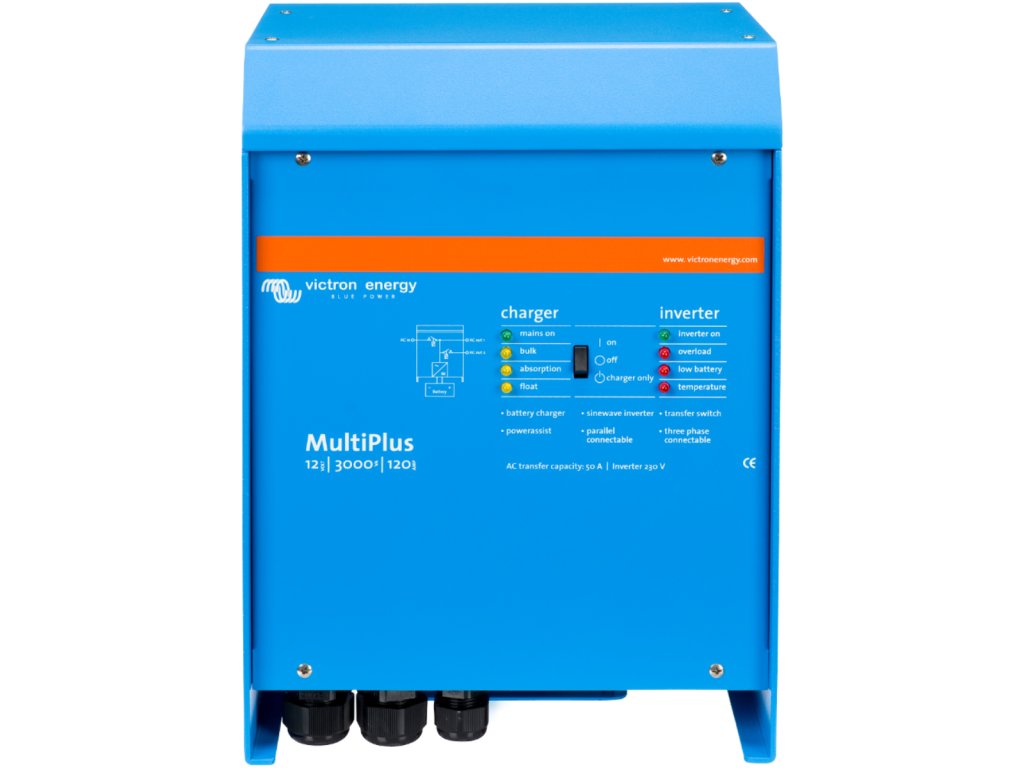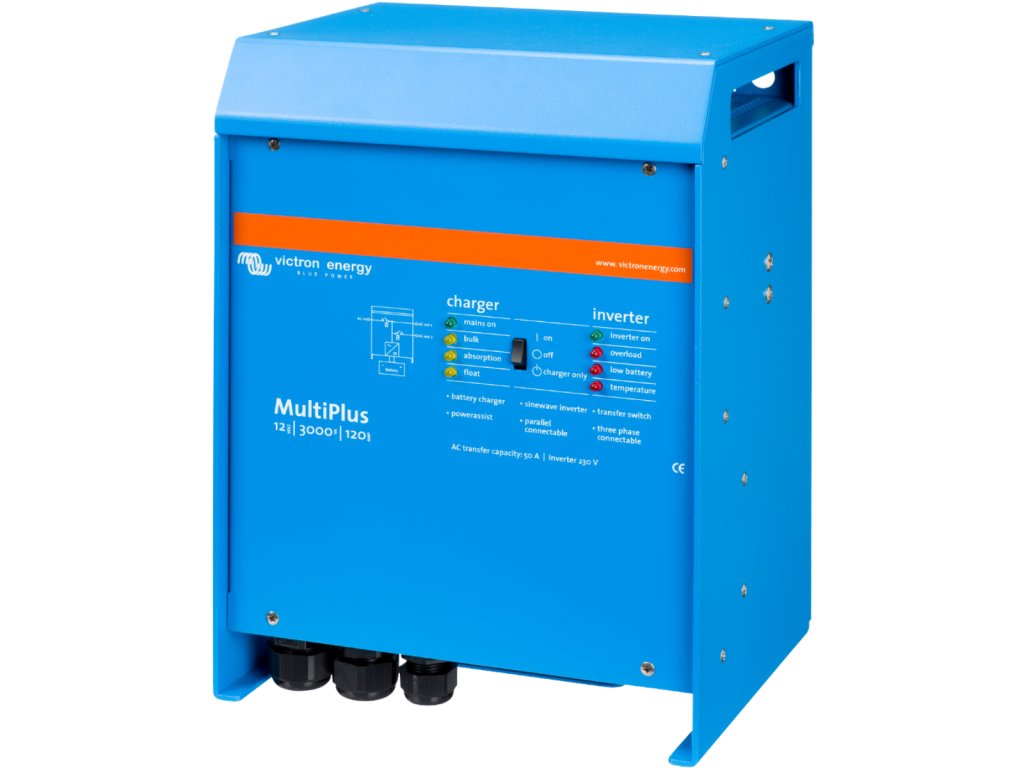 MultiPlus jak napovídá název, je kombinací střídače a nabíječky v jednom elegantním balení. Jeho řada funkcí zahrnuje čistě sinusový měnič, adaptivní nabíjení, technologii PowerAssist a další funkce pro integrace do různých typů systémů. Jeden AC vstupMultiPlus je vybaven jedním AC vstupem pro připojení distribuční sítě nebo např. generátoru.Pokud jsou potřeba dva AC vstupy, pak zvolíme jednotku Quattro. Dva AC výstupyMultiPlus je vybaven dvěma AC výstupy. Hlavní výstup AC1 zajistí dodávky energie bez přerušení. Např. v režimu UPS MultiPlus převezme napájení připojených spotřebičů (za méně než 20 milisekund) v případě výpadku distribuční sítě nebo generátoru.Druhý výstup je funní pouze tehdy, když je k dispozici AC vstup (distribuční síť/generátor). Zátěž, která by rychle vybila akumulátory, jako například ohřívač vody, je tedy možné připojit k tomuto výstupu a bude napájena pouze z AC zdroje (druhý výstup k dispozici u modelů s výkonem 3kVA a vyšší).Čtyři fáze nabíjení adaptivní nabíječkou a dvěma výstupy pro nabíjení baterieHlavní výstup poskytuje výkonné nabíjení akumulátorů prostřednictvím systému "adaptivního nabíjení". Software řídí třístupňový automatický proces dobíjení tak, aby vyhovoval stavu baterie, a přidává čtvrtou fázi dobíjení - udržovací nabíjení. Kromě tohoto, MultiPlus může nabíjet druhou baterii pomocí nezávislého výstupu dobíjení určeného např. pro startovací baterie generátoru. Multiplus je určen pro nabíjení všech typů olověných, alkalických i lithiových baterií. Prakticky neomezený výkon díky paralelnímu provozuAž 6 jednotek MultiPlus může pracovat paralelně k dosažení vyššího výkonu. Třífázový provozTři jednotky stejného typu mohou být konfigurovány pro třífázový provoz. Ale to není vše: až 6 setů tří jednotek lze paralelně propojit a získat tak výkon až 75 kW / 90 kVA měniče a 2000A nabíjecí kapacitu. Unikátní vlastnosti funkce PowerAssistMultiPlus zamezí přetížení výkonově omezeného AC zdroje např. proudově omezené el. přípojky. Pokud by mělo dojít k přetížení vstupního AC zdroje proudu, bude v prvé řadě automaticky snížen nabíjecí proud do baterie. V druhé řadě potom dochází k posílení výstupního AC proudu proudem odebíraným z baterie. Solární energieAC proud můžete mít k dispozici i v případě výpadku distribuční sítě.MuliPlus může být použit jak v off-grid (ostrovních) systémech, tak ve fotovoltaických systémech připojených k distribuční síti. MultiPlus není vybaven vstupem pro FV pole, je ale předurčen ke spolupráci s MPPT regulátory (DC coupling systémy) nebo síťovými měniči (AC coupling systémy). Konfigurace systému V případě samostatné např. UPS instalace, lze jednoduše nastavení provést během několika minut pomocí přepínačů DIP. Paralelní a třífázové aplikace mohou být konfigurovány pomocí softwaru VE.Bus Quick Configure a softwaru VE.Bus System Configurator. Off-grid a hybridní FV instalace pro vlastní spotřebu, které zahrnují síťové střídače nebo solární nabíječe MPPT, lze konfigurovat pomocí Asistenta (specializovaný software pro konkrétní aplikace). Softvare pro konfiguraci si můžete zdarma stáhnout na následujícím odkazu (VE.Configure 3): https://www.victronenergy.com/support-and-downloads/software Pro uvedený SW budete potřebovat PC komunikační rozhraní MK3-USBVzdálený monitoring a konfigurace systémůSledujte a ovládejte svůj systém lokálně (LAN) nebo vzdáleně přes internet z libovolného místa na světě pomocí bezplatné aplikace VRM a bezplatného portálu VRM. https://vrm.victronenergy.com/landingpagePřístup může být z tele:fonu, tabletu, notebooku nebo počítače pro různé operační systémy. Neexistuje žádný konec úrovně ovládání, pomocí jednoho z následujících ovládacích panelů máte k dispozici monitoring a konfiguraci systému odkudkoliv na světě. MultiPlus nabízí mnoho variant provozu a jsme schopni nabídnout řešení na řadu uživatelských požadavků. Zde uvádíme pro představu nejčastější provozní režimy: Režim ESS – Energy Storage SystemTento režim je pouze pro fotovoltaické instalace s dostupnou distribuční sítí (DS), požadavkem na maximální využití vyrobené solární energie v kombinaci s běžnou DS a s možností ukládání přebytečné energie do baterií. Podrobný manuál k ESS systému naleznete na následující odkazu: https://www.victronenergy.com/live/ess:design-installation-manualPříklady konfigurace ESS systémů: 1. Klasická síťová elektrárna doplněná o ukládání energie Jakmile měřák zaznamená dodávku do distribuční sítě (dále jen DS), ESS systém začne ukládat přebytečnou energii do baterie. Jakmile měřák sítě zaznamená nákup energie z distribuční sítě, systém ESS dodává energii z baterie do zátěže. V případě výpadku DS fotovoltaika nejde a kritické spotřebiče (ve schématu „Critical Loads) jsou napájeny z AC výstupu jednotky MultiPlus/Quattro – to zajistí, že nám baterii vybíjí jen prioritní spotřebiče a neprioritní jsou odpojeny. 2. Energii z FV panelů zpracovává MPPT solární regulátor. Toto řešení je vhodnější zejména pro menší instalace a výhodou je vyšší účinnost – DC energie z FV je ukládána přímo do DC baterie. Oproti předchozímu příkladu dosahuje vyšší účinnosti proto, že není potřeba DC proud zpracovávat na AC pomocí síťového střídače a následně je znovu převádět z AC na DC pro uložení do baterie - to způsobuje ztráty 20-30%. V případě výpadku DS (blackoutu) jsou opět napájeny pouze kritické spotřebiče, ale FV systém zůstává plně funní a pracuje ve zcela ostrovním/au
