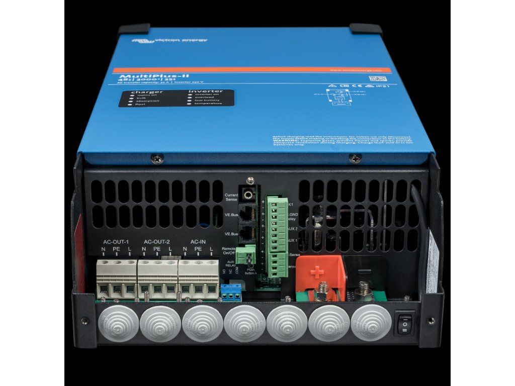 MultiPlus-II je multifunkční měnič/nabíječ s možností připojení externího snímače proudu, který rozšiřuje funkce PowerControl a PowerAssist, ideální pro použití v ostrovních a ESS systémech. Má také všechny funkce jednotky MultiGrid se zabudovanou anti-islanding ochranou na svém AC vstupu – zesílená ochrana zabránění nežádoucím dodávkách do distribuční sítě v případě jejího výpadku.Hlavní vlastnosti:PowerControl a PowerAssistMultiPlus-II zamezí přetížení výkonově omezeného AC zdroje např. proudově omezené el. přípojky nebo generátoru. Pokud by mělo dojít velkým odběrem k přetížení vstupního AC zdroje, bude v prvním kroku automaticky snížen nabíjecí proud do baterie (PowerControl). Energie pro nabíjení je přesunuta pro napájení AC spotřebičů. V druhé kroku dochází k posílení vstupního AC zdroje proudem odebíraným z baterie (PowerAssist). Na AC výstup přichází společně energie z AC zdroje i z baterie (měniče).Solární energieAC proud můžete mít k dispozici i v případě výpadku distribuční sítě. MuliPlus-II může být použit jak v off-grid (ostrovních) systémech, tak ve fotovoltaických systémech trvale připojených k distribuční síti. MultiPlus-II není vybaven vstupem pro FV pole, je ale předurčen ke spolupráci s MPPT regulátory (DC coupling systémy) nebo síťovými měniči (AC coupling systémy) umístěnými na AC vstupu a/nebo AC výstupu.Jeden AC vstupMultiPlus-II je vybaven jedním AC vstupem pro připojení distribuční sítě nebo např. generátoru. Pokud jsou potřeba dva AC vstupy, pak zvolíme jednotku Quattro.Dva AC výstupyMultiPlus-II je vybaven dvěma AC výstupy. Hlavní výstup AC1 zajistí dodávky energie bez přerušení napájení. Např. v režimu UPS MultiPlus-II převezme napájení připojených spotřebičů (za méně než 20 milisekund) v případě výpadku distribuční sítě nebo generátoru. Druhý AC výstup je funkční pouze tehdy, když je k dispozici AC vstup (distribuční síť/generátor). Zátěž, která by rychle vybila akumulátory, jako například ohřívač vody, je tedy možno připojit k tomuto výstupu a ta bude napájena pouze z AC zdroje.Prakticky neomezený výkon díky paralelnímu a třífázovému provozuAž 6 jednotek MultiPlus-II může pracovat paralelně k dosažení vyššího výkonu. Např. šest jednotek 48/5000/70 poskytuje 25kW/30kVA výstupní výkon a nabíjecí výkon 420 A. Tři jednotky stejného typu mohou být nakonfigurovány pro třífázový provoz s fázovým posunem. Ale to není vše, až 6 paralelně řazených jednotek může tvořit jednu fázi. Třífázový systém tak může sestávat až z 18 jednotek se souhrnným trvalým výstupním výkonem 75kW/90kVA a nabíjecím výkonem 1200 A.Modely MultiPlus-II 8k, 10k a 15k lze paralelně zapojit pouze v případě použití externího přepínače pro přenos střídavého proudu. Pro více informací naleznete v aplikační příručce MultiPlus-II External Transfer Switch.ESS: Systémy pro skladování energieMultiPlus-II je klíčovým prvkem v systému Victron Energy ESS, který poskytuje flexibilitu pro kombinaci se solárními MPPT regulátory nebo se síťovými FV měniči.Konfigurace, monitorování a řízení systému lokálněNastavení lze změnit pomocí softwaru VEConfigure (je třeba počítač nebo notebook a rozhraní MK3-USB).Vzdálená konfigurace a monitorováníNainstalujte Cerbo GX nebo jiné zařízení GX pro připojení k internetu. Provozní data lze bezplatně ukládat a zobrazovat na webových stránkách VRM (Victron Remote Management). Po připojení k internetu lze k systémům přistupovat vzdáleně a měnit jejich nastavení. K dispozici je několik možností monitorování a ovládání: Cerbo GX, Ekrano GX, Color Control GX, Venus GX, laptop, počítač, Bluetooth (s volitelným VE.Bus Smart dongle), Battery Monitor, Digitální Multi Control Panel.Čtyři fáze nabíjení adaptivní nabíječkou se dvěma výstupy pro nabíjení baterieHlavní DC výstup poskytuje výkonné plnohodnotné nabíjení akumulátorů prostřednictvím systému "adaptivního nabíjení". Software řídí třístupňový automatický proces dobíjení tak, aby vyhovoval stavu baterie, a přidává čtvrtou fázi dobíjení - udržovací nabíjení. MultiPlus-II je určen pro nabíjení všech typů olověných, alkalických i lithiových baterií.Konfigurace systémuV případě jednoduché např. UPS instalace, lze nastavení snadno provést během několika minut pomocí DIP přepínačů na MultiPlusu-II nebo softwarem VE.Configure 3 a PC. Paralelní a třífázové aplikace mohou být konfigurovány pomocí softwaru VE.Bus Quick Configure (do tří jednotek) nebo složitější systémy pomocí softwaru VE.Bus System Configurator (nad tři jednotky) a PC.Off-grid a hybridní FV instalace pro podporu vlastní spotřeby a větší energetické nezávislosti, které zahrnují síťové střídače a/nebo solární MPPT nabíječe, lze konfigurovat pomocí softwaru VE.Configure 3 s využitím příslušných asistentů (specializované funkce pro konkrétní aplikace).MultiPlus-II disponuje několika programovatelnými relé a pomocnými kontakty pro celou řadu doplňkových funkcí. Základní software VE.Configure 3 ale i ostatní softwary pro možnost konfigurace si můžete zdarma stáhnout na následujícím odkazu: https://www.victronenergy.com/support-and-downloads/softwarePro uvedené softwary budete potřebovat PC komunikační rozhraní MK3-USB.Technické parametry: výstupní napětí: 230 VAC ± 2 % Frekvence: 50 Hz ± 0,1 % vstupní napětí: 187-265 VAC, frekvence: 45 – 65 Hz trvalý výkon při 25ºC: 3000 VA / 2400W špičkový výkon: 5500 W transferový proud: 32A max. účinnost: 93% vlastní spotřeba: max. 13 W vlastní spotřeba v „Search“ modu: 3 W rozpětí provozních teplot: -40 do +65