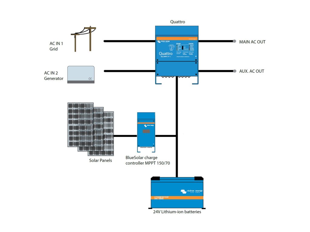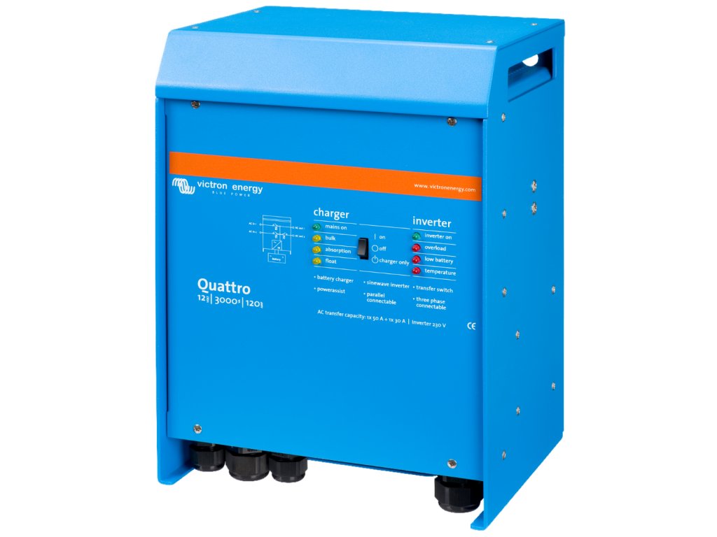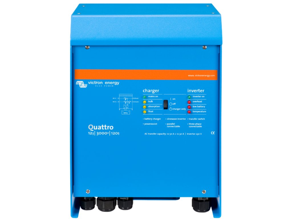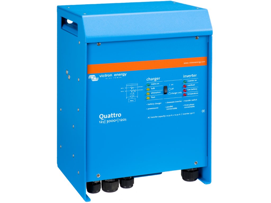 Základní rozdíl mezi jednotkou MultiPlus a Quattro: MultiPlus má k dispozici jeden AC vstup (například pro připojení elektrocentrálu nebo distribuční sítě), Quattro pak 2 AC vstupy (například pro připojení distribuční sítě a elektrocentrály současně). Dva AC vstupyJednotka Quattro je vybavena dvěma AC vstupy pro připojení distribuční sítě a např. generátoru. Dva AC výstupyQuattro je vybaven dvěma AC výstupy. Hlavní výstup AC1 zajistí dodávky energie bez přerušení. Např. v režimu UPS Quattro převezme napájení připojených spotřebičů (za méně než 20 milisekund) v případě výpadku distribuční sítě nebo generátoru.Druhý výstup je funní pouze tehdy, když je k dispozici AC vstup (distribuční síť/generátor). Zátěž, která by rychle vybila akumulátory, jako například ohřívač vody, je tedy možné připojit k tomuto výstupu a bude napájena pouze z AC zdroje.Čtyři fáze nabíjení adaptivní nabíječkou a dvěma výstupy pro nabíjení baterieHlavní výstup poskytuje výkonné nabíjení akumulátorů prostřednictvím systému "adaptivního nabíjení". Software řídí třístupňový automatický proces dobíjení tak, aby vyhovoval stavu baterie, a přidává čtvrtou fázi dobíjení - udržovací nabíjení. Kromě tohoto, Quattro může nabíjet druhou baterii pomocí nezávislého výstupu dobíjení určeného např. pro startovací baterie generátoru. Quattro je určen pro nabíjení všech typů olověných, alkalických i lithiových baterií. Prakticky neomezený výkon díky paralelnímu provozuAž 6 jednotek Quattro může pracovat paralelně k dosažení vyššího výkonu. Třífázový provozTři jednotky stejného typu mohou být konfigurovány pro třífázový provoz. Ale to není vše: až 6 setů tří jednotek lze paralelně propojit a získat tak výkon až 144 kW / 180 kVA měniče a 2500A nabíjecí kapacitu. Unikátní vlastnosti funkce PowerAssistQuattro zamezí přetížení výkonově omezeného AC zdroje např. proudově omezené el. přípojky. Pokud by mělo dojít k přetížení vstupního AC zdroje proudu, bude v prvé řadě automaticky snížen nabíjecí proud do baterie. V druhé řadě potom dochází k posílení výstupního AC proudu proudem odebíraným z baterie. Solární energieAC proud můžete mít k dispozici i v případě výpadku distribuční sítě.Quattro může být použit jak v off-grid (ostrovních) systémech, tak ve fotovoltaických systémech připojených k distribuční síti. Quattro není vybaven vstupem pro FV pole, je ale předurčen ke spolupráci s MPPT regulátory (DC coupling systémy) nebo síťovými měniči (AC coupling systémy). Konfigurace systému- V případě samostatné např. UPS instalace, lze jednoduše nastavení provést během několika minut pomocí přepínačů DIP.- Paralelní a třífázové aplikace mohou být konfigurovány pomocí softwaru VE.Bus Quick Configure a softwaru VE.Bus System Configurator.- Off-grid a hybridní FV instalace pro vlastní spotřebu, které zahrnují síťové střídače nebo solární nabíječe MPPT, lze konfigurovat pomocí Asistenta (specializovaný software pro konkrétní aplikace).- Softvare pro konfiguraci si můžete zdarma stáhnout na následujícím odkazu (VE.Configure 3): https://www.victronenergy.com/support-and-downloads/software Pro uvedený SW budete potřebovat PC komunikační rozhraní MK3-USB Vzdálený monitoring a konfigurace systémůSledujte a ovládejte svůj systém lokálně (LAN) nebo vzdáleně přes internet z libovolného místa na světě pomocí bezplatné aplikace VRM a bezplatného portálu VRM. https://vrm.victronenergy.com/landingpage Přístup může být z telefonu, tabletu, notebooku nebo počítače pro různé operační systémy. Neexistuje žádný konec úrovně ovládání, pomocí jednoho z následujících ovládacích panelů máte k dispozici monitoring a konfiguraci systému odkudkoliv na světě: Color Control GX nebo Venus GX .