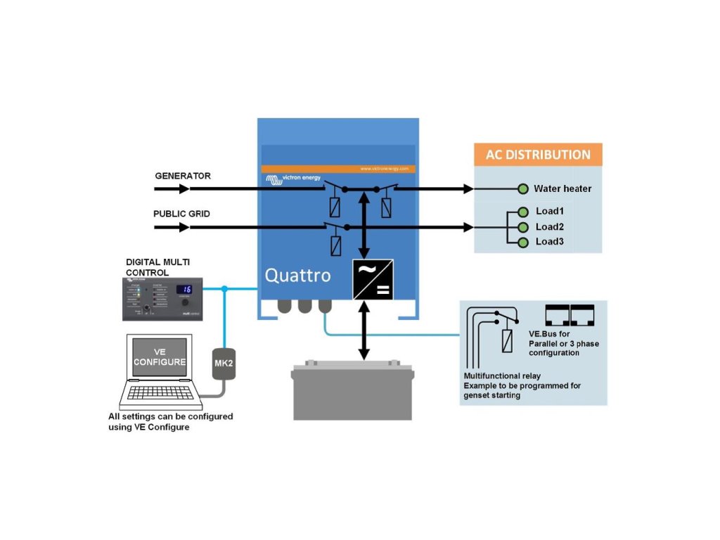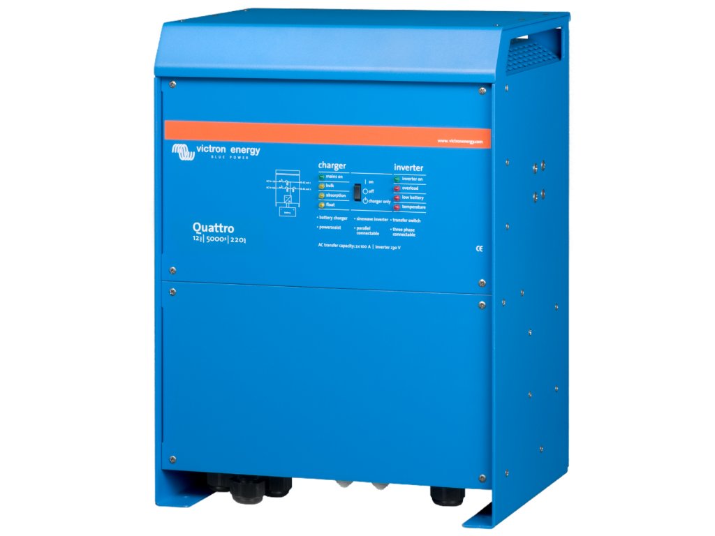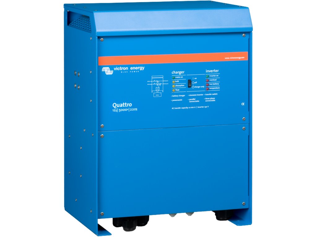 MultifunníMěnič/nabíječ Quattro je výkonný DC-AC střídač /invertor/ s čistě sinusovým výstupním napětím, se sofistikovanou adaptivní nabíječkou baterie a ultra rychlým přepínačem smyčky napájení /bypassu/. Střídač je umístěn v hliníkovém kompaktním krytu. Modelové řady se vyrábí o výkonu 3000VA-10000VA. Dva AC vstupyQuattro je vybaveno dvěma navzájem nezávislými AC vstupy (hlavní rozdíl oproti řadě MultiPlus) jako sít a generátor nebo dva generátory. Zařízení je schopno se v případě potřeby automaticky připojit ke zdroji, který je právě k dispozici.Dva AC výstupyQuattro je standardně vybaveno dvěma AC výstupy. Hlavním výstup je vybaven funkcí, která zajistí dodávky energie bez přerušení. Quattro převezme napájení připojených spotřebičů v případě výpadku sítě nebo generátoru. To se děje tak rychle (méně než 20 milisekund), že počítače a další elektronická zařízení budou i nadále fungovat bez přerušení.Druhý výstup je pod napětím pouze tehdy, když AC je k dispozici na jednom ze vstupů Quattra. Zátěž, která by rychle vybila akumulátory, jako například ohřívač vody, klimatizace, elektrická trouba je možné připojit k tomuto výstupu.Prakticky neomezený výkon díky paralelnímu provozuAž 10 jednotek Quattro může pracovat paralelně k dosažení vyššího výkonu.Třífázový provozTři jednotky stejného modelu mohou být sestaveny do třífázového výstupu. Ale to není vše: až 10 třífázových sestav (celkem tedy 30 jednotek) může být paralelně propojeno a poskytnout tak výstupní výkon až 270 kW/300 kVA s nabíjecí kapacitou akumulátorů až 4 000 A. PowerControl – omezení přetížení zdroje střídavého (AC) prouduQuattro je velmi silná nabíječka akumulátorů. Je schopná odebírat velké množství proudu z generátoru nebo sítě (až 16 A u každé jednotky modelu 48/5000/70 pracující při 230 V na straně střídavého proudu). Na každém vstupu střídavého proudu lze nastavit limit maximálního odběru energie k zabránění přetížení zdroje střídavého (AC) proudu. Unikátní vlastnosti funkce PowerAssistPovyšuje funkci PowerControl na další úroveň. Zamezí přetížení výkonově omezeného střídavého (AC) zdroje proudu. Pokud by mělo dojít k přetížení zdroje proudu bude v prvé řadě automaticky snížen nabíjecí proud baterie. V druhé řadě potom dochází k posílení výstupního výkonu připojeného generátoru nebo místního napájení (např. proudově omezené el. přípojky) výkonem odebíraným z akumulátorů. Solární energie: Střídavý (AC) proud je k dispozici i v případě selhání síťového zdrojeQuattro může být s výhodami využito v off-grid systémech se solárními panely nebo dalšími alternativními zdroji energie. Nastavení systému nebylo nikdy jednodušší!Ihned po instalaci je přístroj připraven plnit svojí funkci. Pokud je potřeba změnit nastavení, dá se to provést velmi jednoduše vestavěnými DIP přepínači v řádu několika málo minut. Dokonce i paralelní zapojení jednotek lze provádět pomocí DIP přepínačů, žádný počítač na to není potřeba! Alternativně lze nastavení provést pomocí VE.net ovládacího panelu nebo sofistikovaným softwarem (VE.Bus Quick Configure a VE.bus System Configurator), který nabízí další rozšířené možnosti nastavování.Čtyři etapy nabíjení adaptivní nabíječkou s dvěma výstupy pro nabíjení akumulátorůHlavní výstup poskytuje výkonné nabíjení akumulátorů prostřednictvím systému "adaptivního nabíjení" . Software řídí třístupňový automatický proces dobíjení tak, aby vyhovoval stavu a typu akumulátoru, a přidává čtvrtou fázi udržovací nabíjení. Kromě tohoto Quattro umožňuje nabíjet druhý pomocný akumulátor pomocí nezávislého výstupu dobíjení určeného např. pro startovací akumulátor generátoru (pouze 12 a 24 V modely).Pro nastavení parametrů a pro zobrazení aktuálního stavu jednotky se používá PC komunikační rozhraní MK2-USB.Základní technická data:Pracovní DC napětí: 12 VTrvalý AC výkon při 25 °C: 5000 VA (nelineární zátěž, činitel výkyvu 3:1)Trvalý AC výkon při 25 °C: 4500 WMaximální nabíjecí DC proud: 220 AMaximální odběr AC proudu (ze sítě, generátoru) 1. vstupu: 100 AMaximální odběr AC proudu (ze sítě, generátoru)2. vstupu: 100 A .