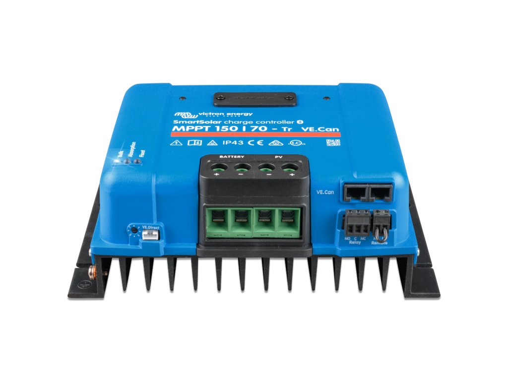Victron Energy SmartSolar 150/70-Tr VE.Can je moderní MPPT regulátor pro 12/24V solární systémy s FV vstupem až 150 V a vysokým nabíjecím výkonem pro výkonnější sestavy. MPPT řízení průběžně optimalizuje odběr z panelů, takže získáte více energie i při proměnlivém osvitu nebo částečném zastínění. Varianta „Tr“ se svorkami je určená pro pevné zapojení vodičů a rozhraní VE.Can usnadní propojení do systému Victron a monitoring v rámci celé instalace. Vestavěné Bluetooth umožní rychlé nastavení a kontrolu v aplikaci VictronConnect.