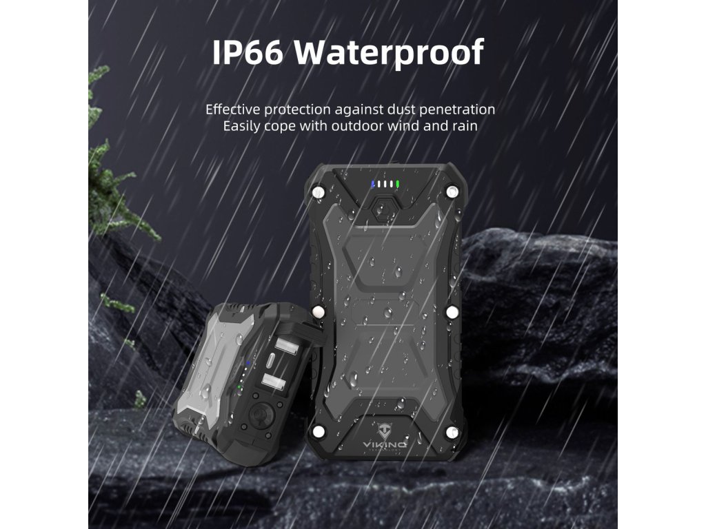 Outdoorová powerbanka Viking SKADI II je vyrobena z odolného materiálu (ABS+PC), který snese náročné podmínky v přírodě. Voděodolné (IP66) a nárazuvzdorné (SHOCKPROOF) provedení znamená, že ji můžete bezpečně používat při turistice, kempování, horolezectví nebo jiných aktivitách.