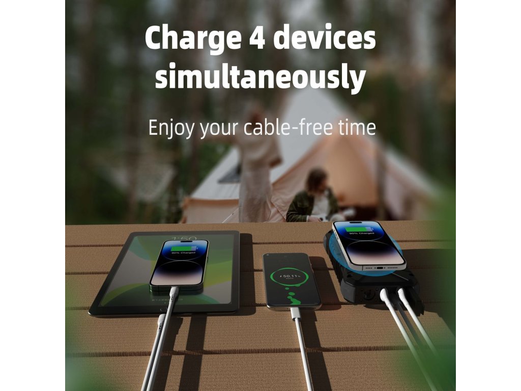 Díky podpoře rychlonabíjení PD30W nemusíte zbytečně dlouho čekat na plné nabití powerbanky a můžete rovnou vyrazit za dobrodružstvím. Rychlé nabíjení podporují také výstupní porty USB-A a USB-C.