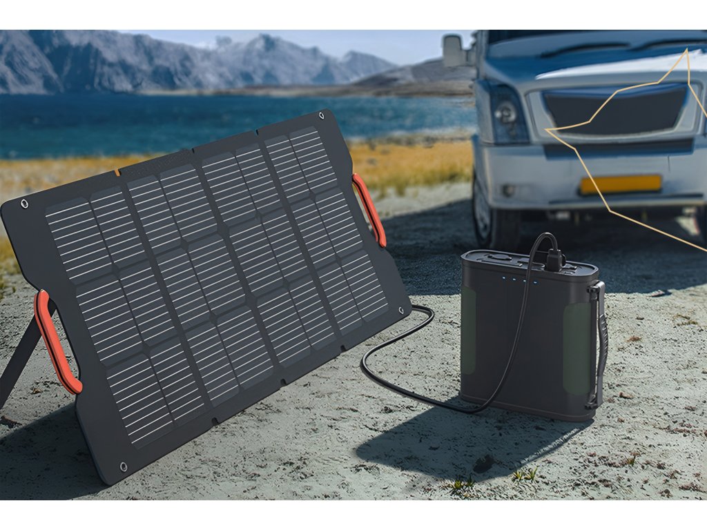 - Rychlé nabíjení přes USB-C, DC nebo solární panel (vstup až 100 W, dobití za cca 6 hodin)