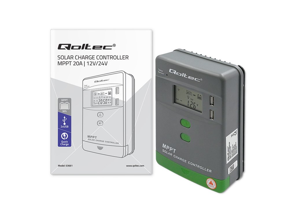 Qoltec MPPT 20A | 12/24V | LCD | BT | 2× USB | GEL / LiFePO4