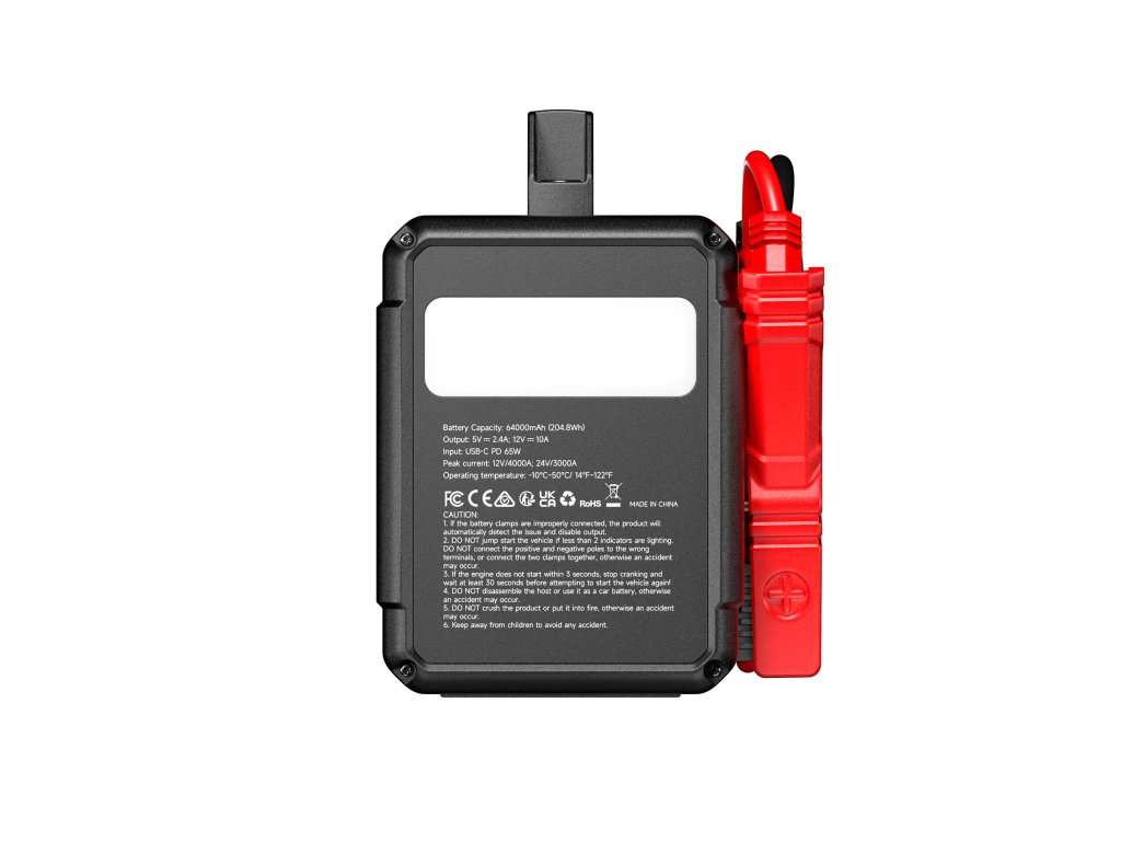 Startovací proud až 4000A (12V), 3000A (24V) • kapacita baterie 64000mAh/204,8 Wh • 16l (benzín) / 16l (diesel) • USB-A 12W max. • DC JACK výstup 120W max. • USB-C vstup PD65W • LED svítilna • všestranná elektrická ochrana • hmotnost 4kg