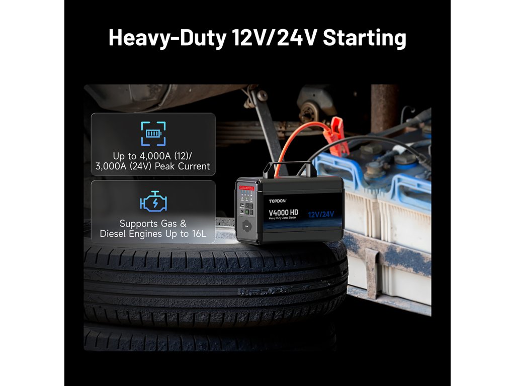 TOPDON V4000 HD je špičkový startovací zdroj navržený ty nejnáročnější a nestandardní podmínky. Tento profesionální model zvládá 12V i 24V systémy a je určen nejen pro osobní automobily, ale také pro nákladní vozy, autobusy, stavební techniku a těžká pracovní vozidla.