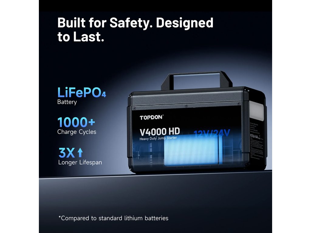 V4000 HD s bezpečnou LiFePO4 baterie s kapacitou 64 000 mAh (204,8 Wh). Ta poskytuje dostatek energie pro opakované starty – až 60 startů u 12V vozidel nebo 30 startů u 24V systémů na jedno nabití.