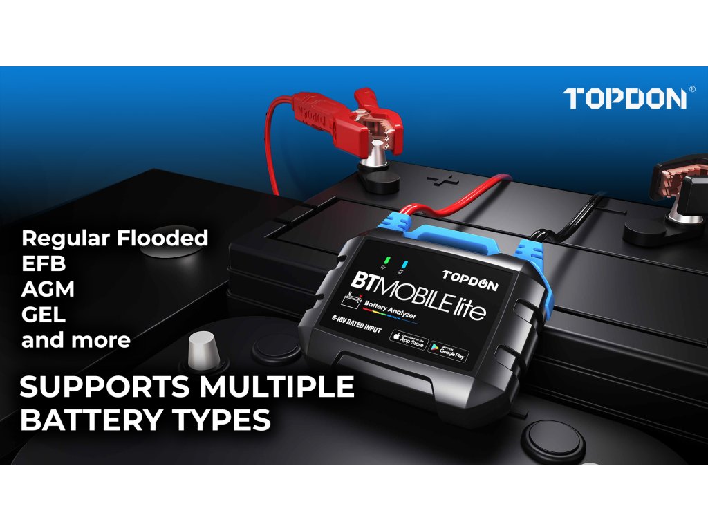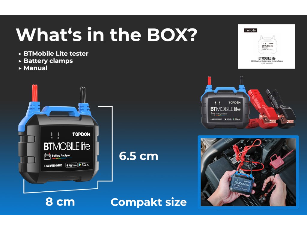 BT Mobile Lite je kompatibilní s nejběžnějšími typy baterií, jako jsou zaplavené, s vápníkem (Ca/Ca), GEL, EFB, AGM, hybridní atd.
