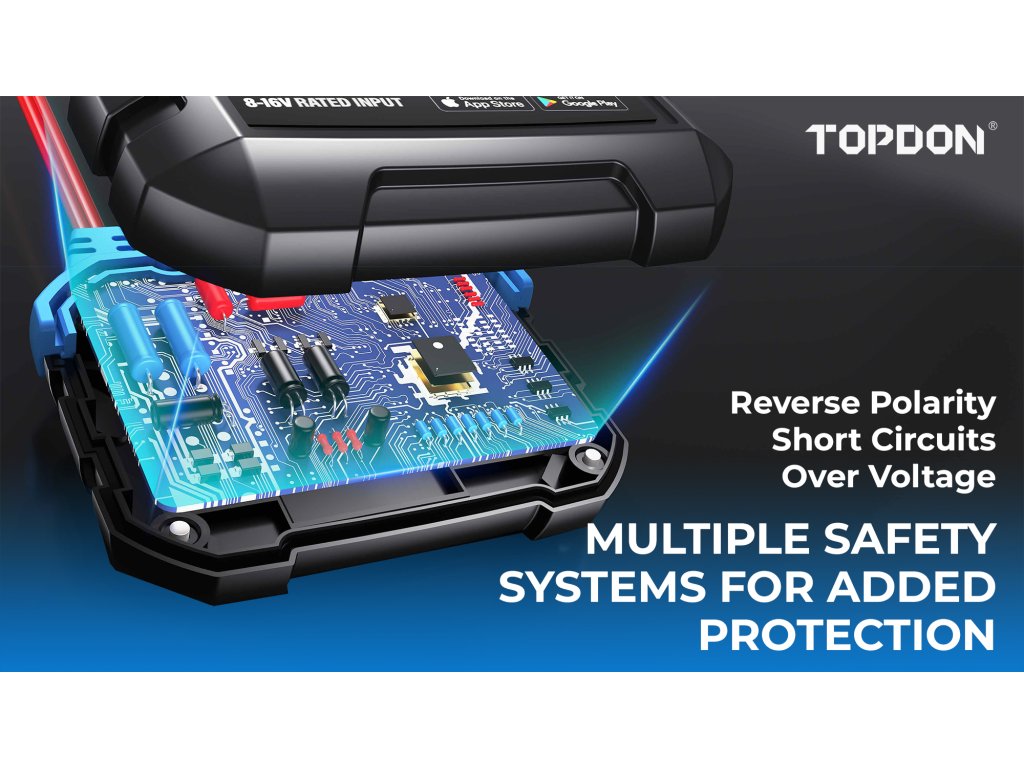 Díky technologii několikanásobné ochrany je tento produkt zcela uživatelsky bezpečný. Nemusíte se bát jiskření, přepólování, zkratu ani přepětí! Vaše zařízení i vozidlo zůstávají s TOPDONEM v bezpečí.
